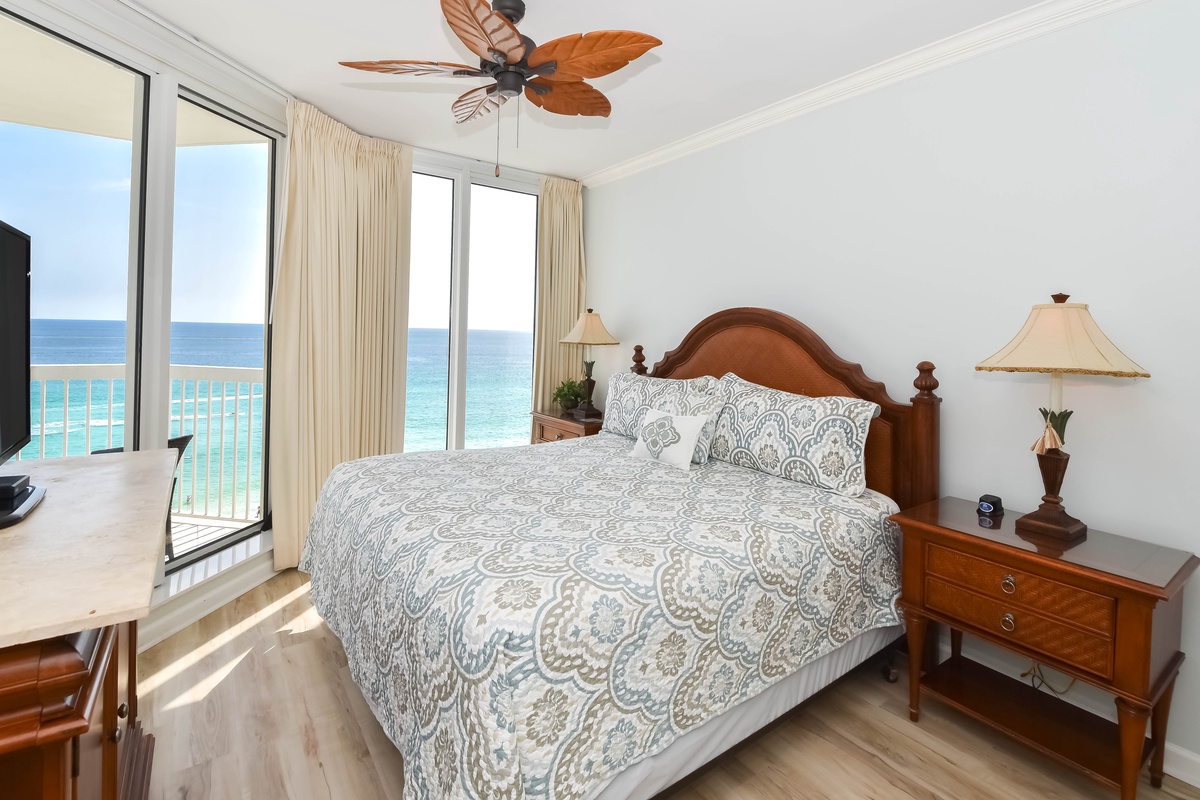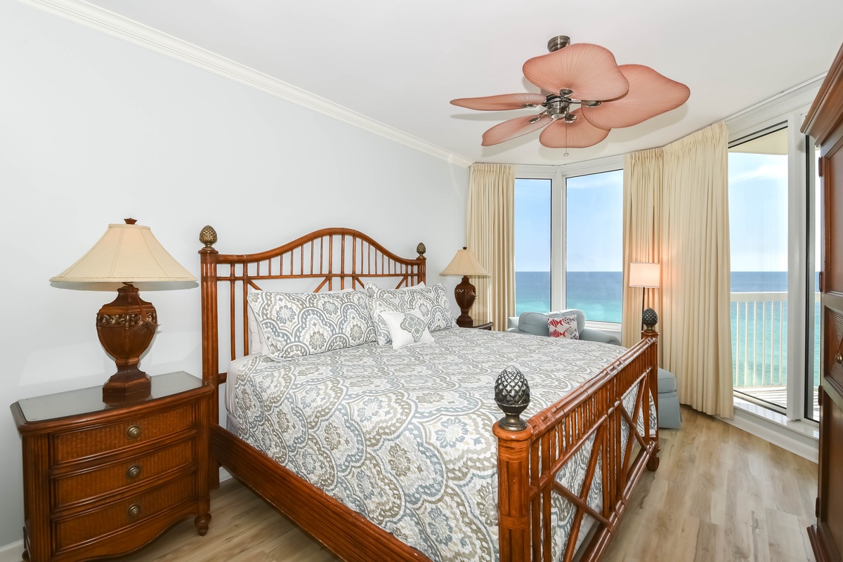 The master bedroom has a king bed, walk-in closet, flat-screen TV, and private access to the beachfront balcony. The master bathroom features a jetted bathtub, walk-in shower, and double vanity. The guest bedroom has a king bed, a flat-screen TV, and private access to the beachfront balcony. Just steps from both the guest bedroom and living area is a full guest bathroom with a walk-in shower.