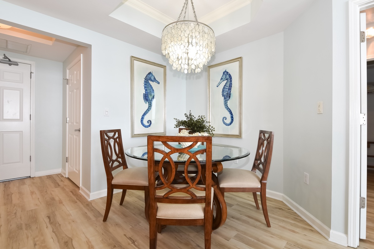 West 905 offers a coastal feel with an inviting open-concept living area. You’ll find the perfect space for family and friends to relax together around the large flat-screen TV. The couch even converts to a queen sleeper sofa to accommodate larger parties. The south wall has floor-to-ceiling windows that open directly onto the furnished beachfront balcony. The dining area offers seating for four with two additional seats at the breakfast bar. The fully equipped kitchen features full-size stainless-steel appliances and includes all the cookware and dishware needed to create memorable meals together. The laundry room is right off the kitchen complete with a stackable HE front-loading washer and dryer.